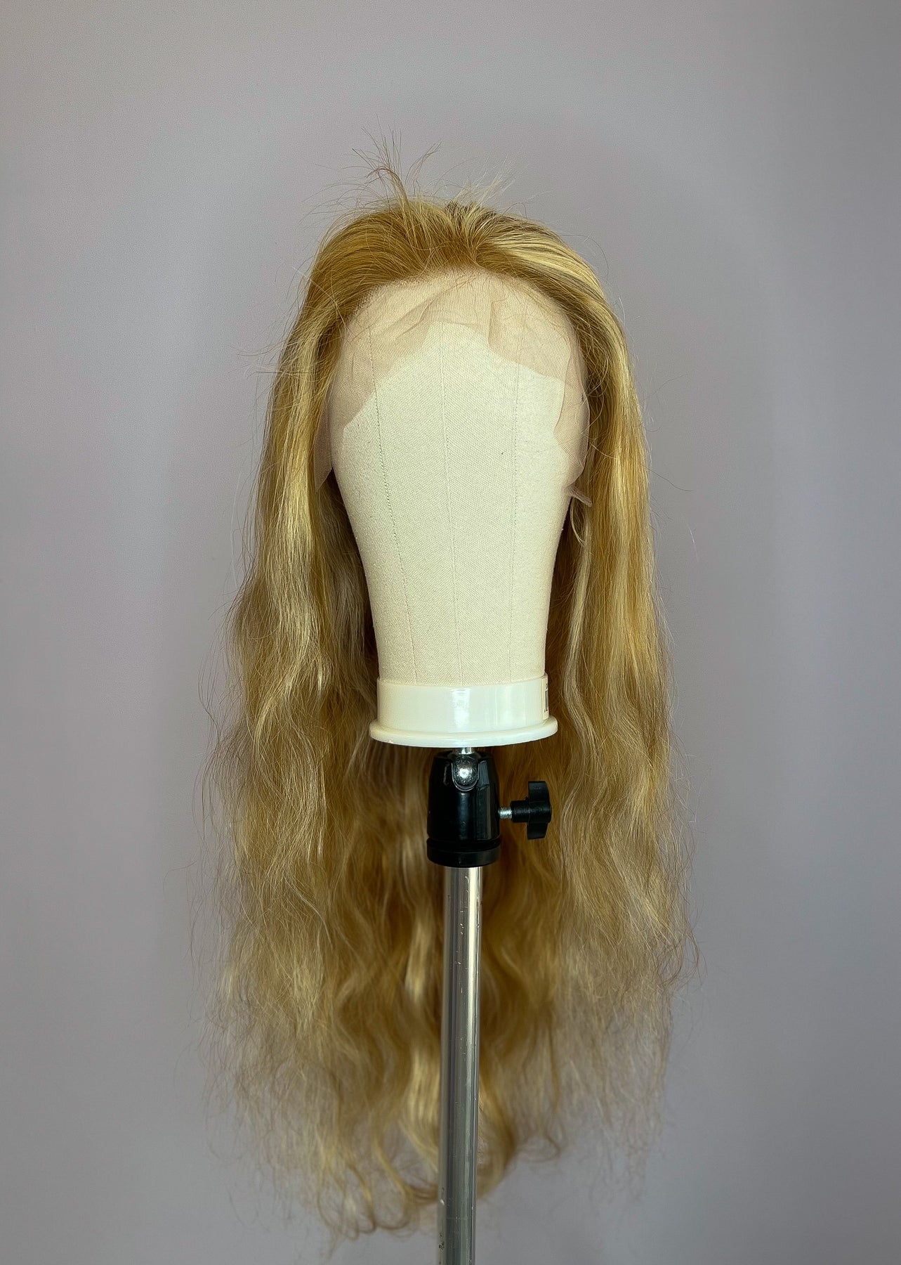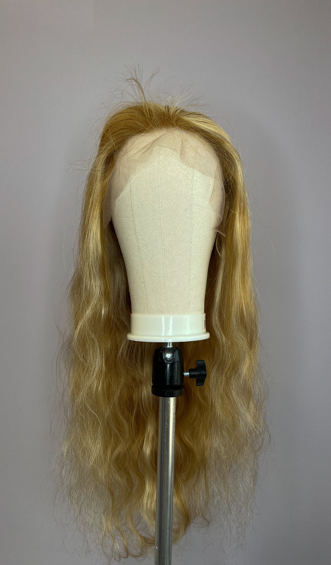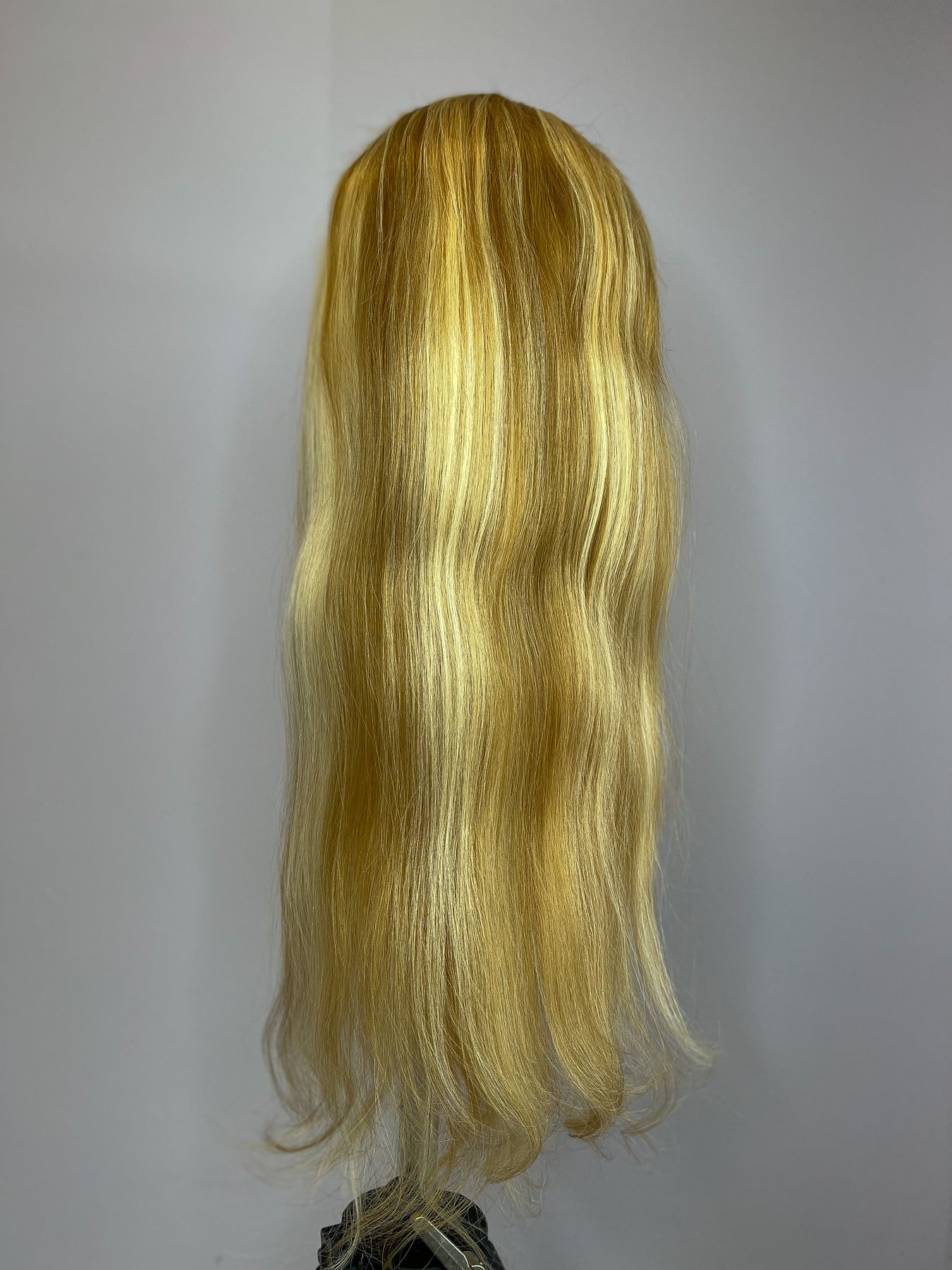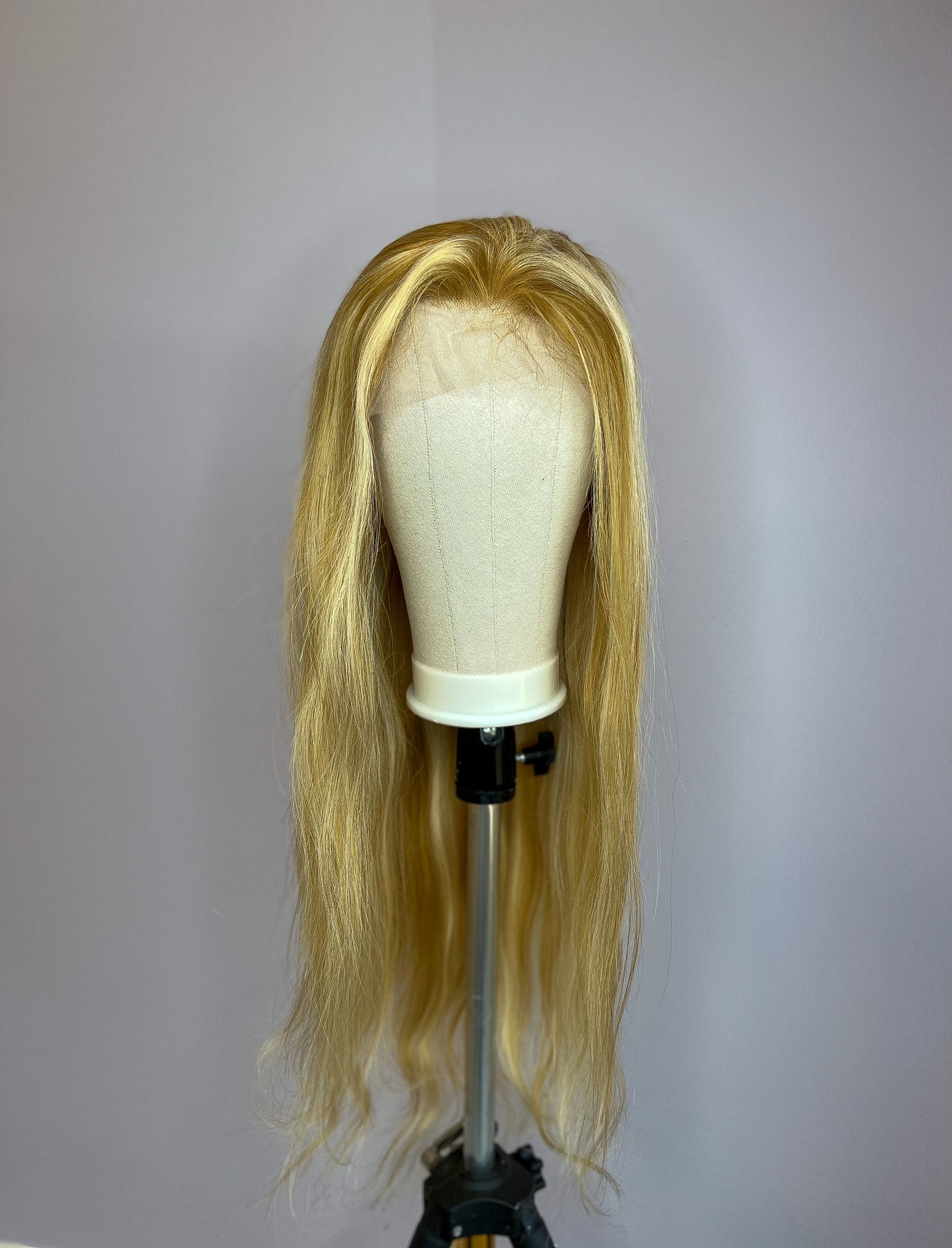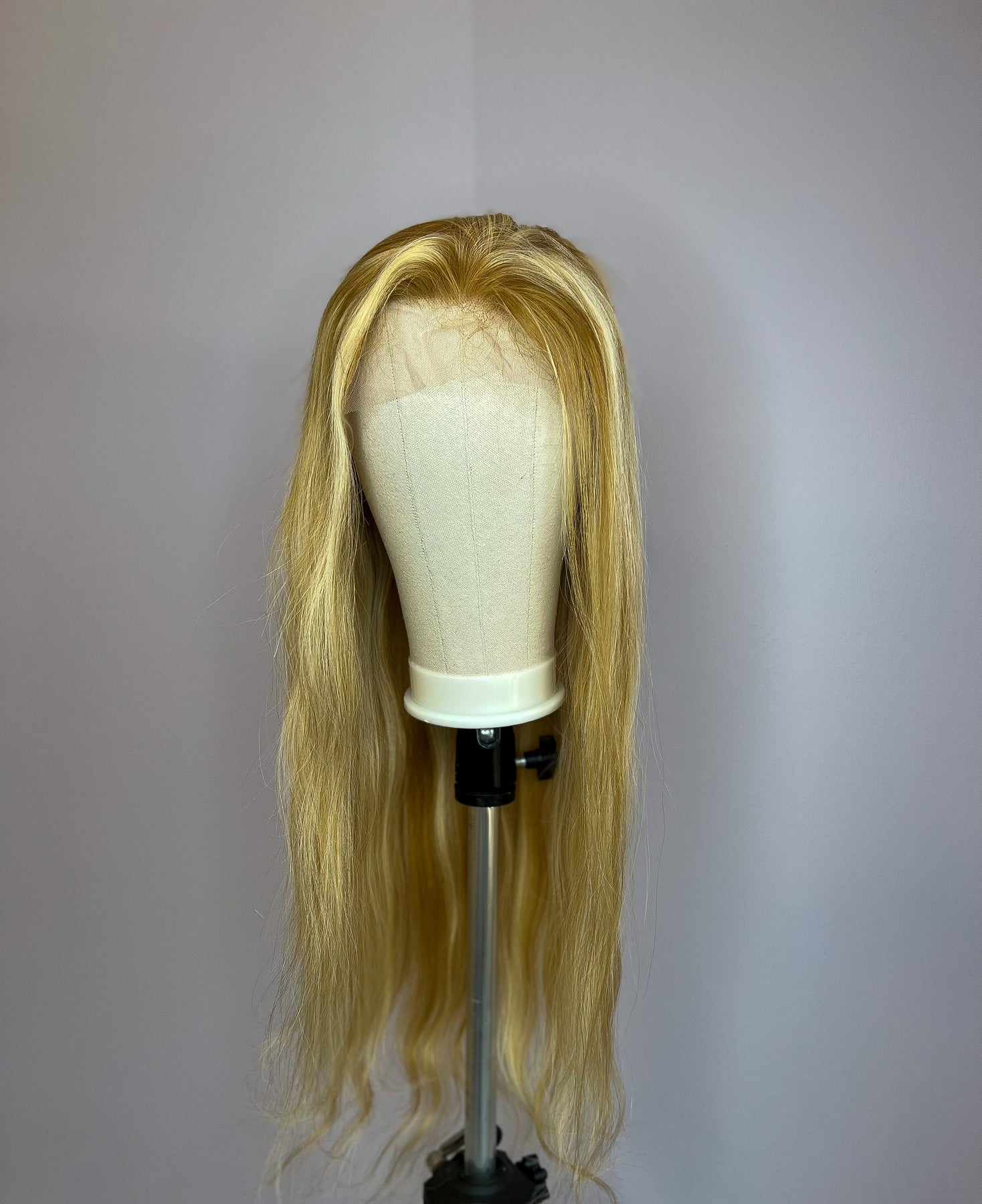 Custom colored 613 highlight 13x4 transparent frontal unit with 2 bands and clips included, natural pre-plucked and single knotted lace perfect for a glueless option.