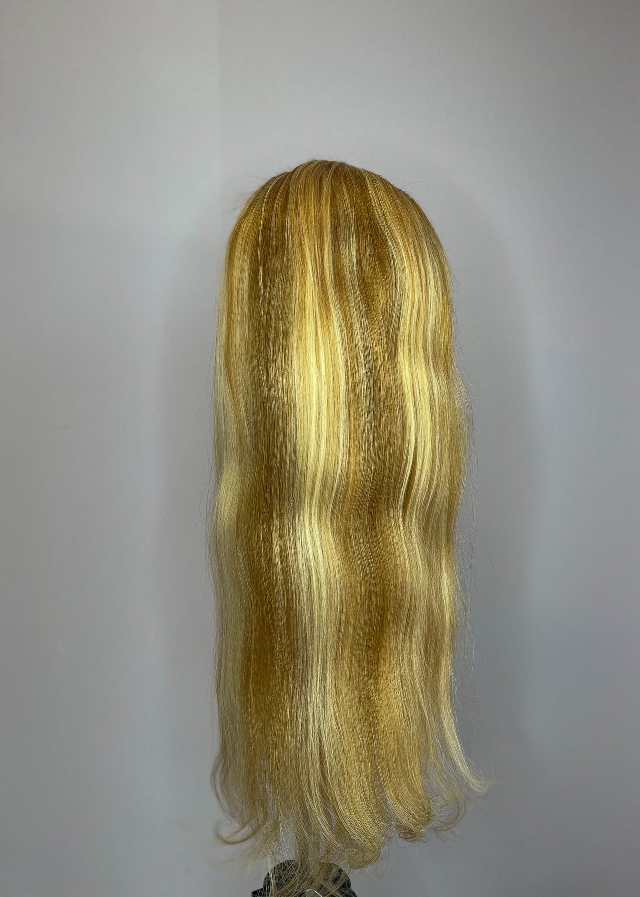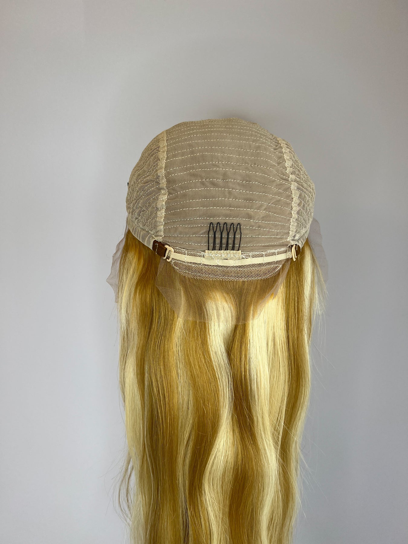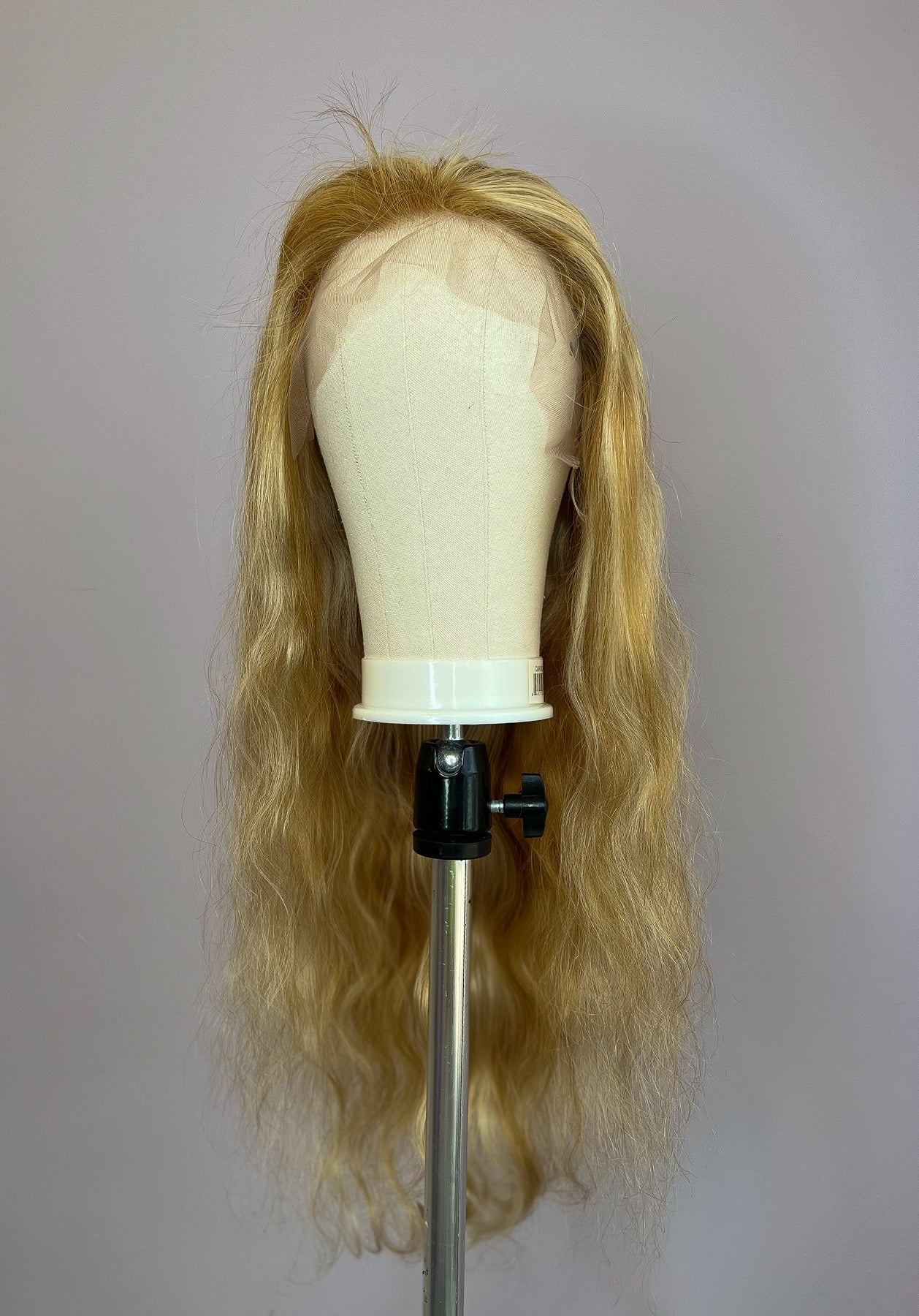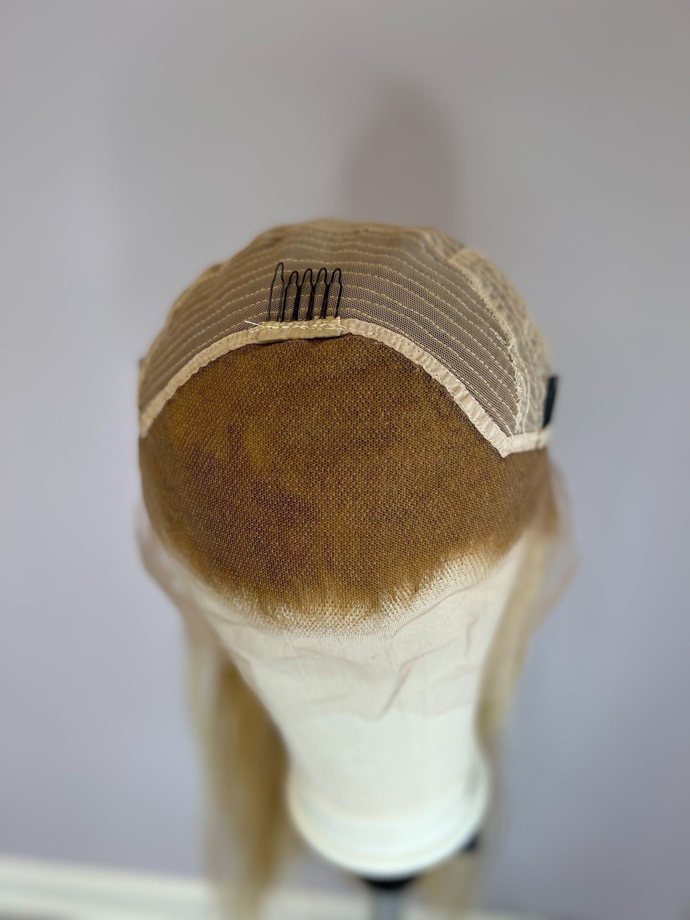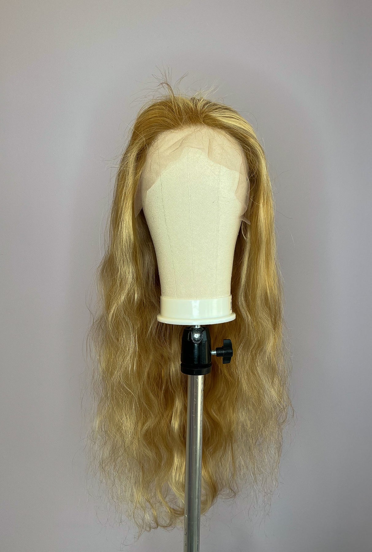 Custom colored 613 highlight 13x4 transparent frontal unit with 2 bands and clips included, natural pre-plucked and single knotted lace perfect for a glueless option.